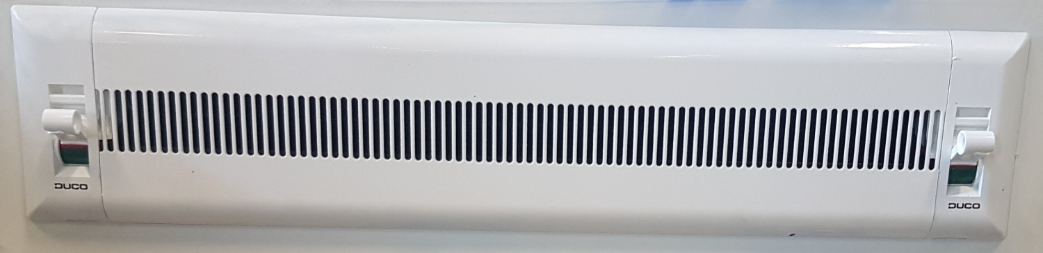 Aan de binnenzijde is het afgeronde rooster fraai afgewerkt (kunststof, wit, onzichtbare bevestiging). Via een thermisch gescheiden verbinding wordt dit binnenrooster met een regeninslagvrij buitenprofiel verbonden. En dat geheel wordt af-fabriek kant-en-klaar in de opstand verwerkt. De onderzijde van de ventilatiedoorgang zit op (min.) 150mm hoogte van de onderzijde van de opstand.